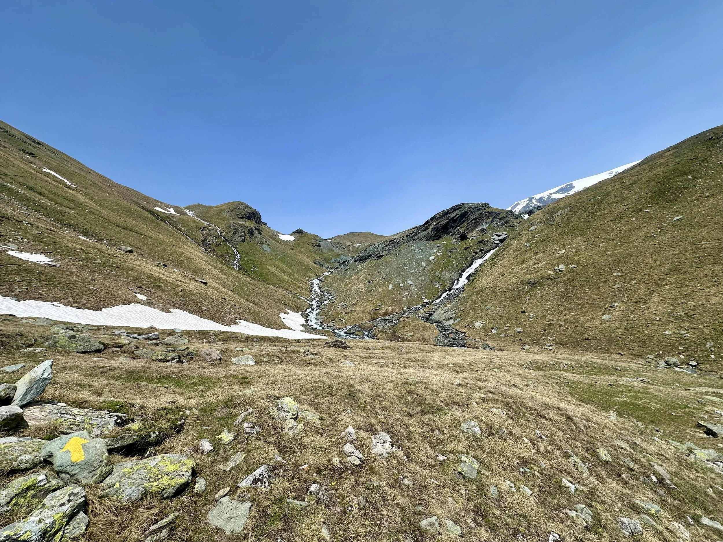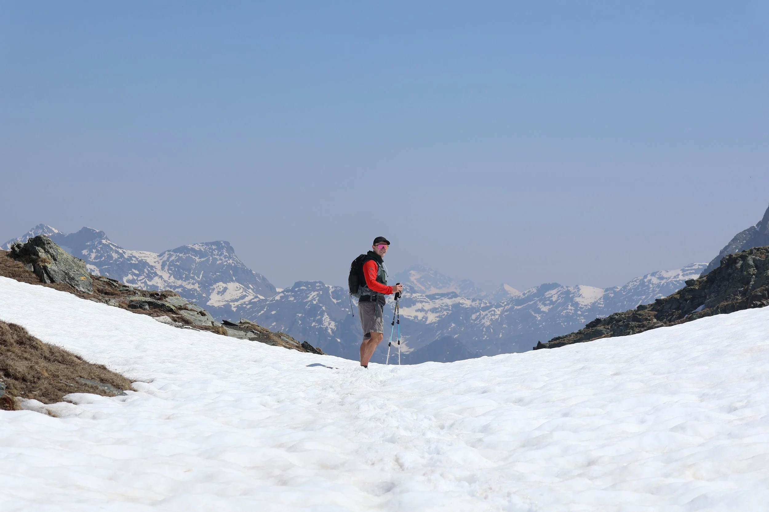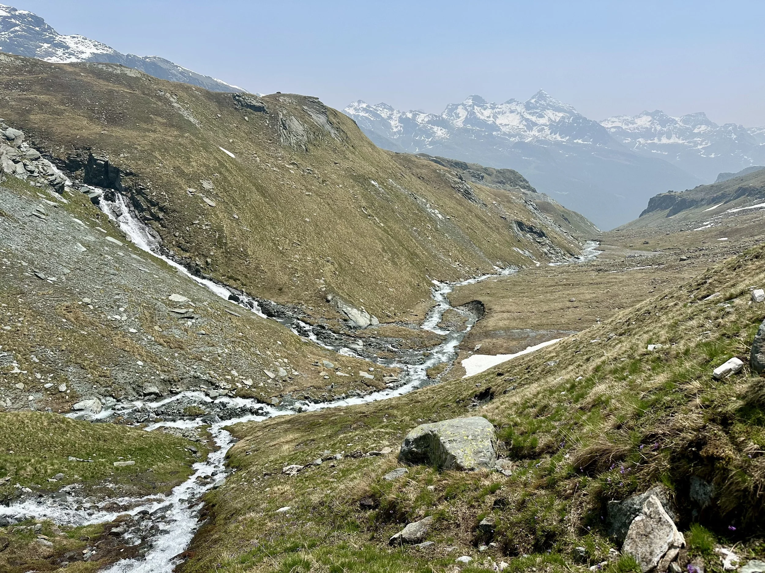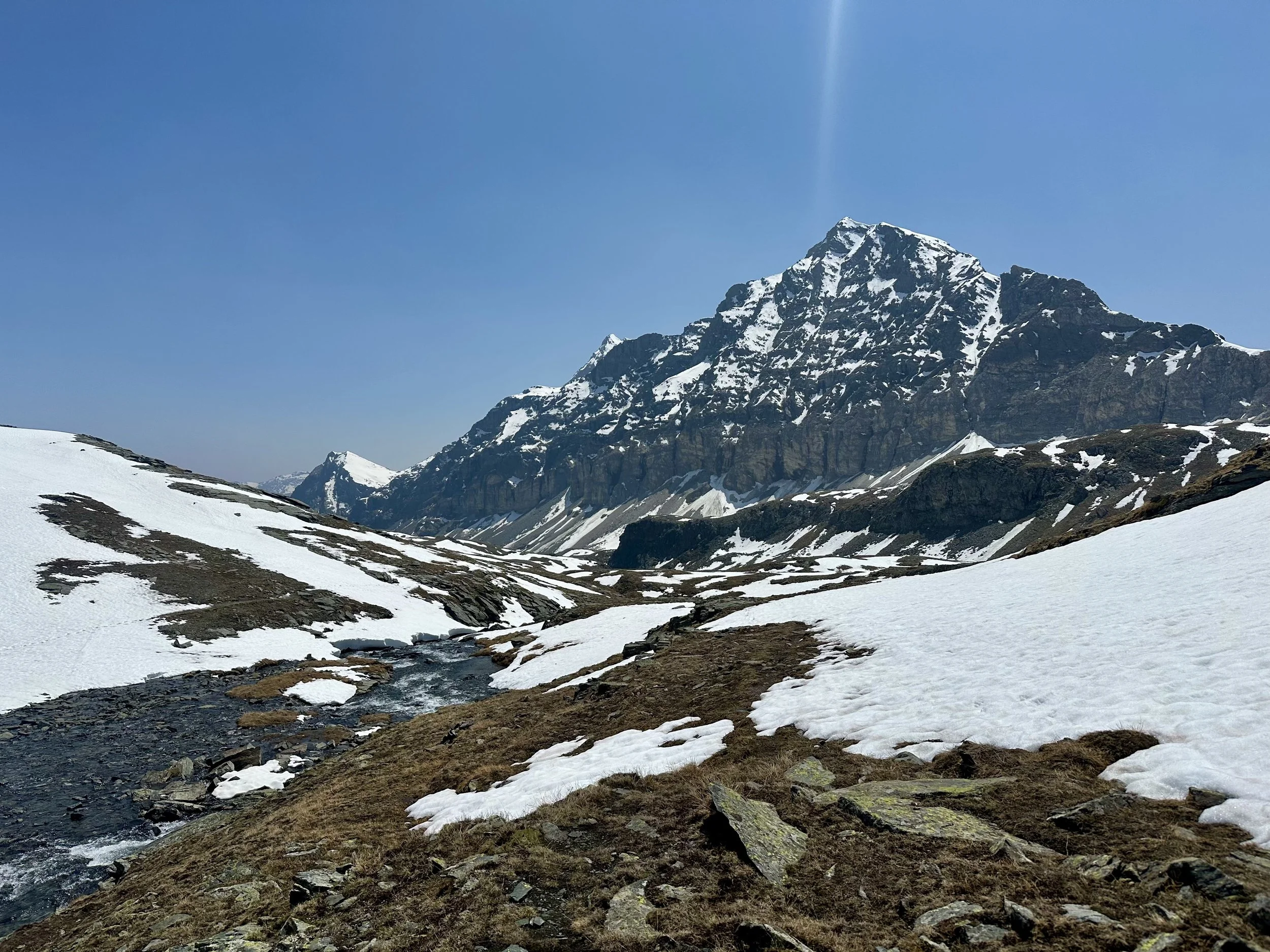 The return, we realized, was much easier than the ascent. The trail was clearer, footing easier. We also got lucky with a few wildlife sightings. Peter was downhill from me facing up when I saw a large male alpine ibex dart only a few feet behind him. I pointed and shouted as the buck bounded up a slope to rejoin another. Animal encounters are all I ever hope for on hikes, so I plopped down and took about a hundred photos, content to linger as the pair grazed their way to the ridge. On the way down, we also spotted several females, plus marmots and frogs. This wasn’t a curated trail—it was true wilderness.
