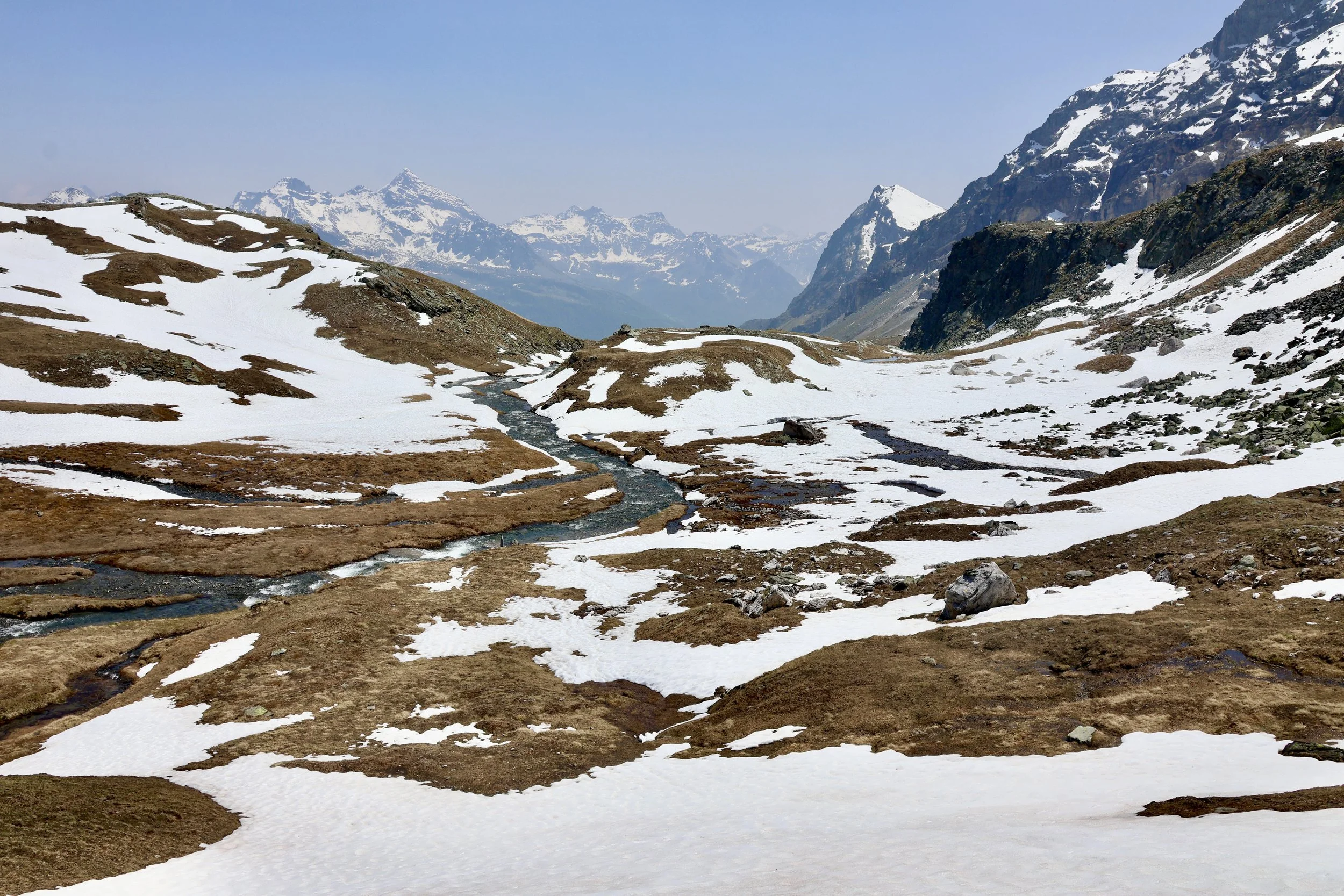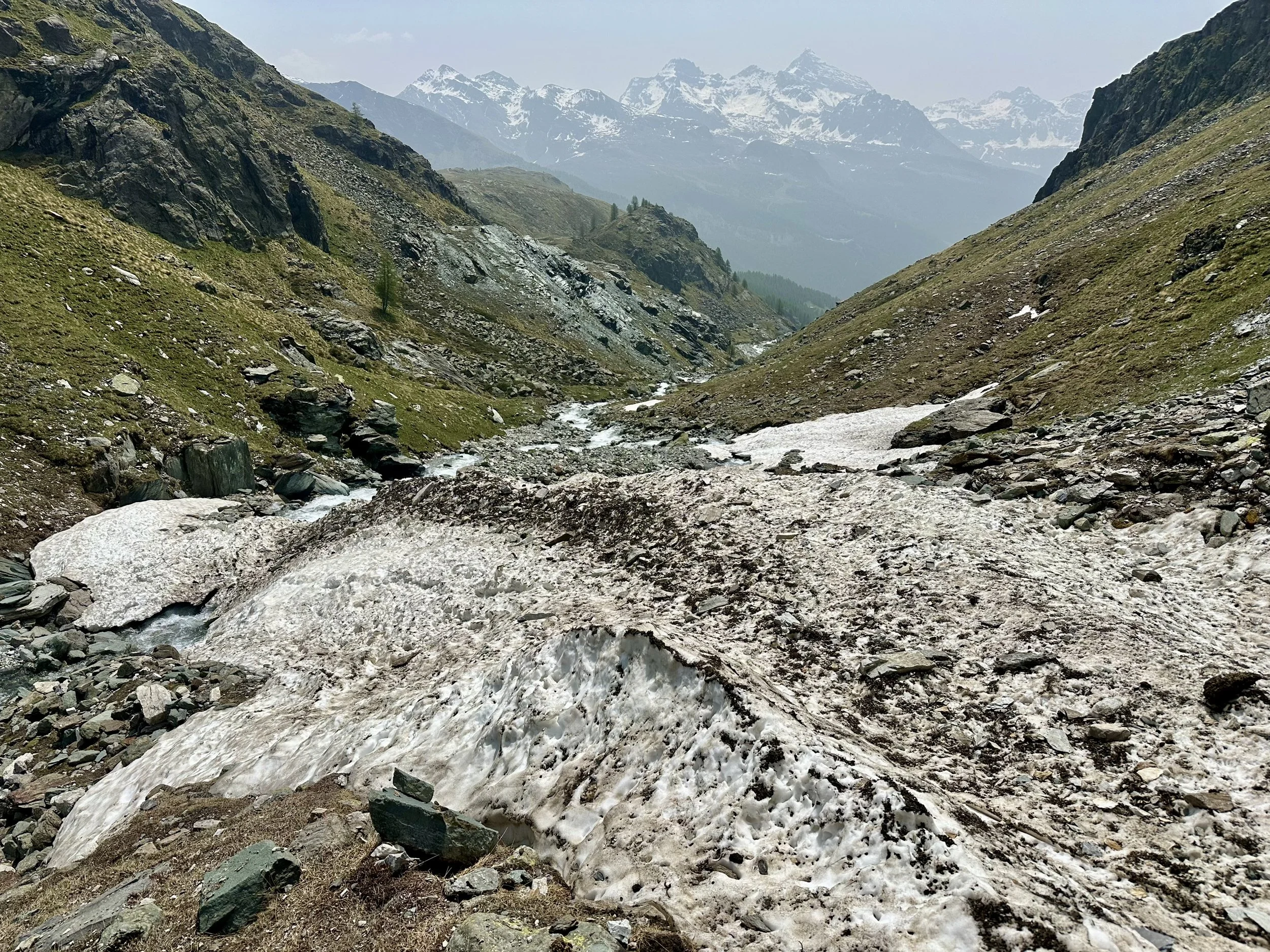 The final push upward took us into a vast snow bowl, with Switzerland just over the ridge. We debated climbing another hour or two to the top, but a late return was already certain. Instead, we angled across the snow in a broad cardinal direction, shoes soaked from rivulets streaming down the mountainside. Most of the snow was packed enough to make it across, but every once in a while I got a jolt of surprise as my leg postholed through the snow up to mid-thigh.