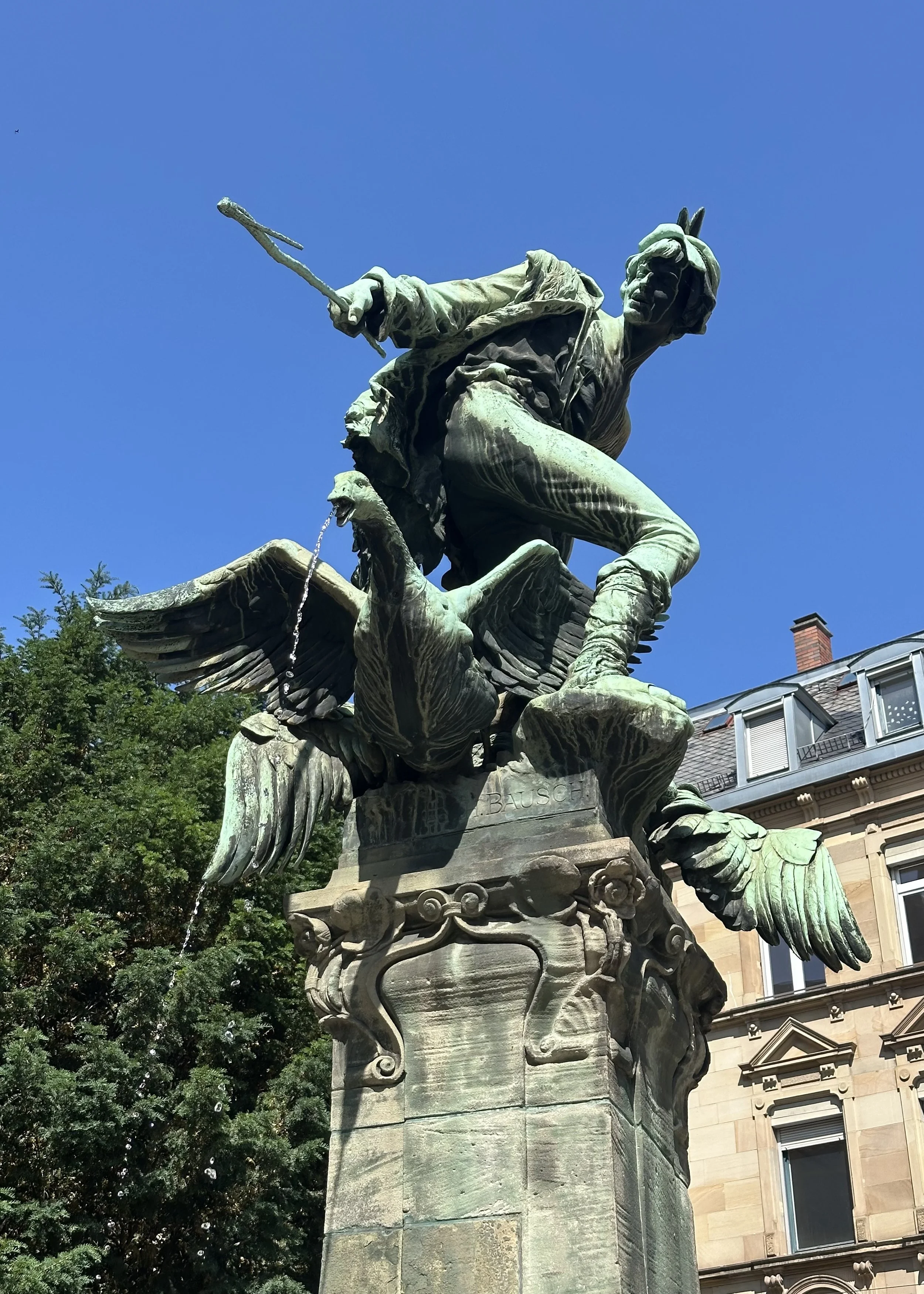 Gänsepeterbrunnen fountain depicting a scene from the Hans-im-Glück Brothers Grimm story