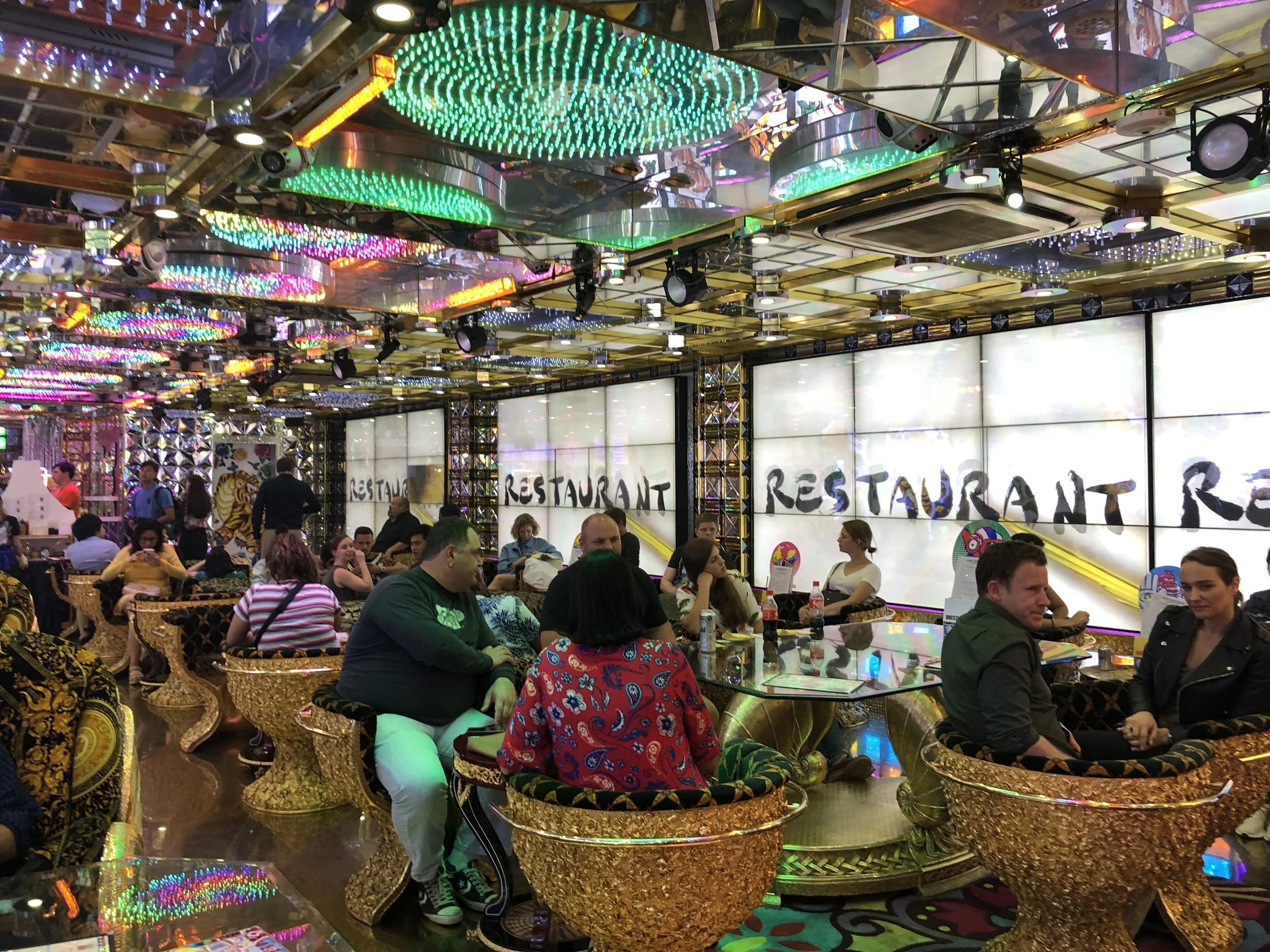 Robot Restaurant advised us to arrive at least 30 minutes prior to showtime, which we realized was an excuse for guests to wait in the bar. Foreigners of all ages and nationalities occupied gaudy, gold chairs and sipped cocktails while listening to a quartet clad in gold robot uniforms. The amount of gold reflected thousands of times over by scattered mirrors would have made 1980s Donald Trump proud.