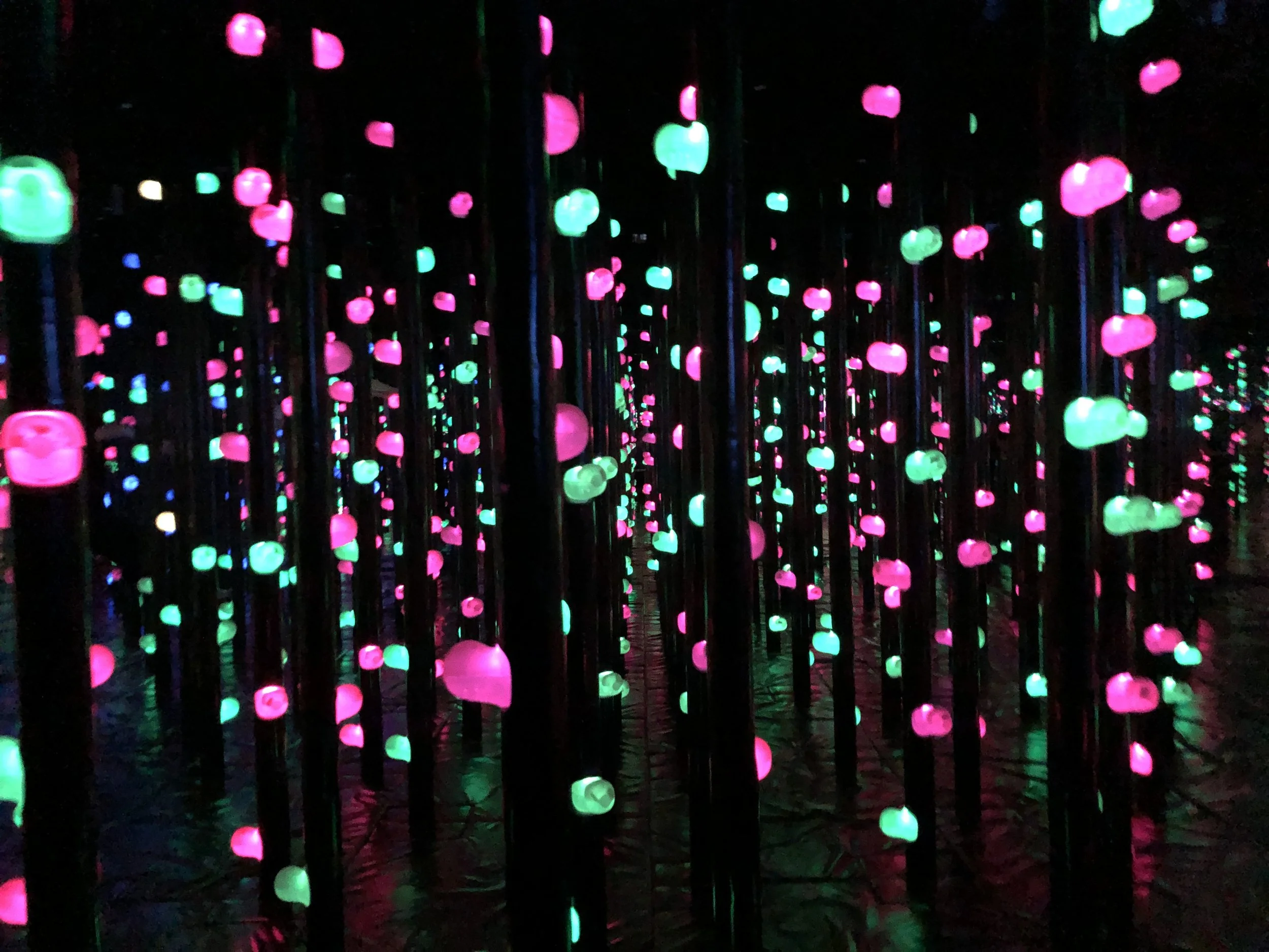 The teamLab experience felt much more nuanced. My cousin, Kasey, and I felt like curious children, exploring more and more hidden pockets of the museum. The quality of the graphic design was enhanced with interactive experiences meant to bring the audience closer to the art. One exhibit included a forest of posts that stood in rows. Each post contained different colored lights that acted as footholds or grips in rock climbing. Attendees could line up across the edge of the forest and rock climb their way to the other side.