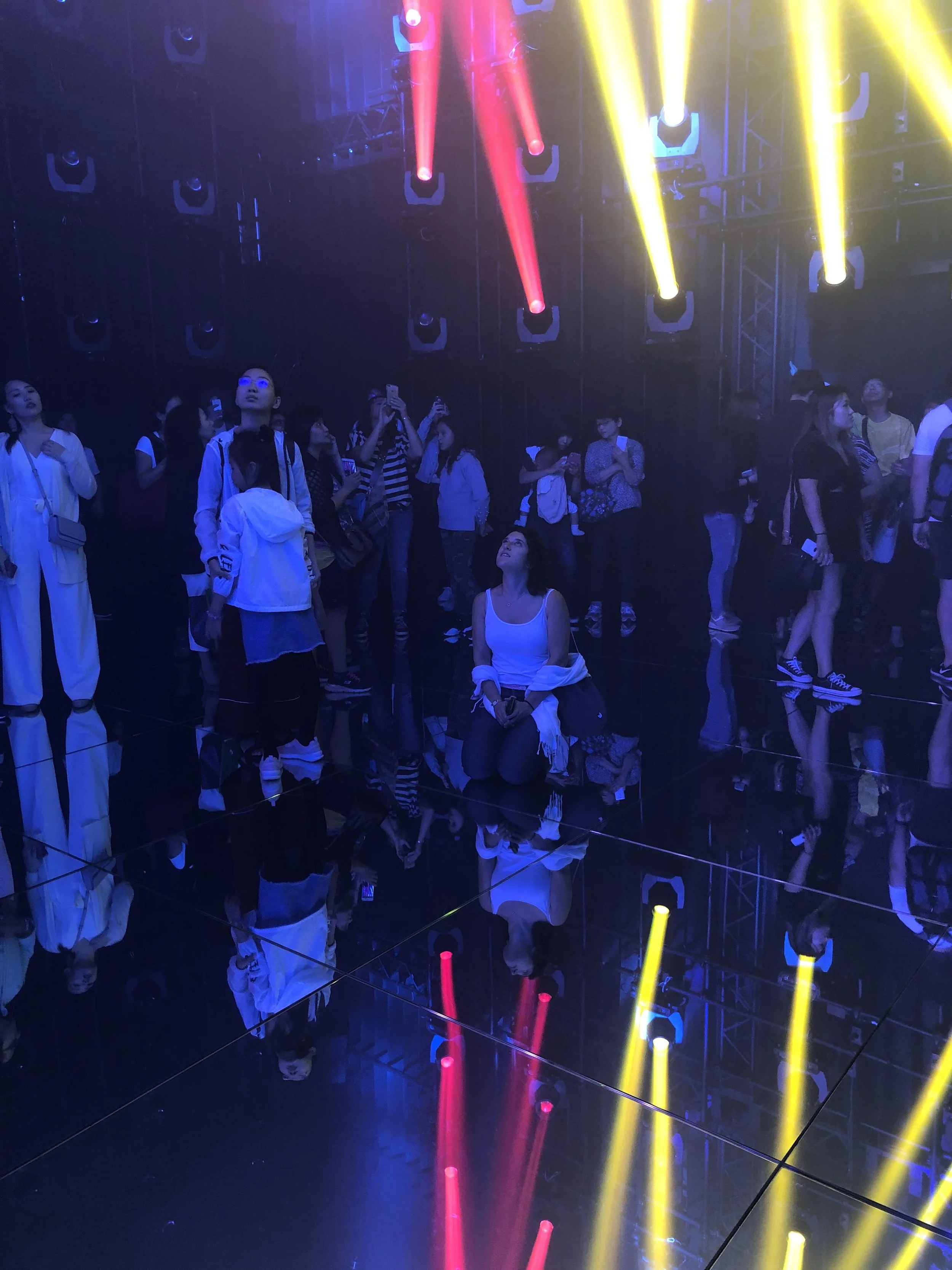 However, at teamLab, the lights, sounds, and physical landscape were in complete harmony. Though the music was loud at some points, it was never uncomfortable or overpowering. One light display was set to an epic orchestral piece that perfectly synced with the movement of the light beams. My cousin sat on the mirrored floor and looked down at the reflection as I gazed up toward the dancing light fixtures on the ceiling. We were both entranced by the sound symphony: