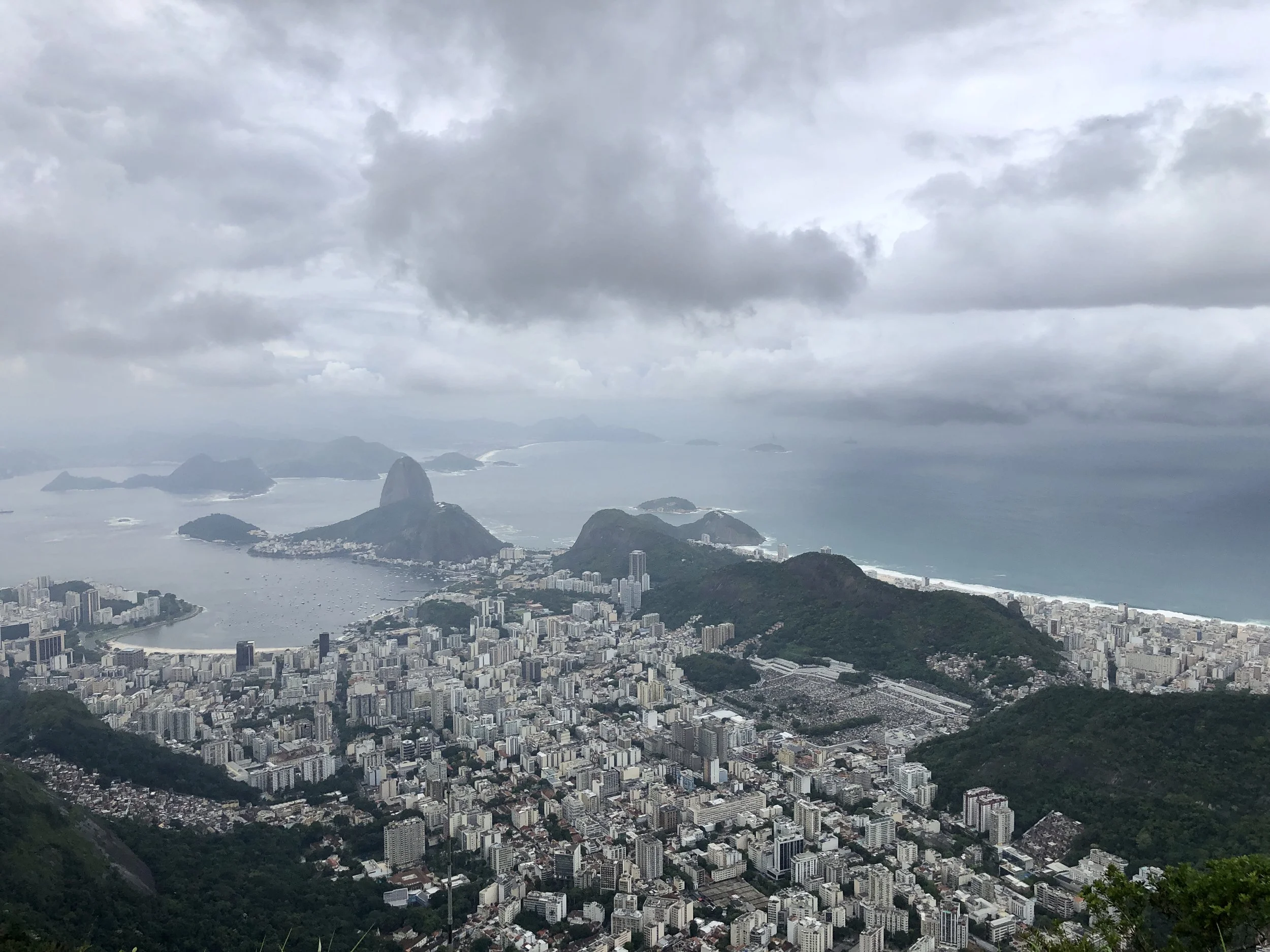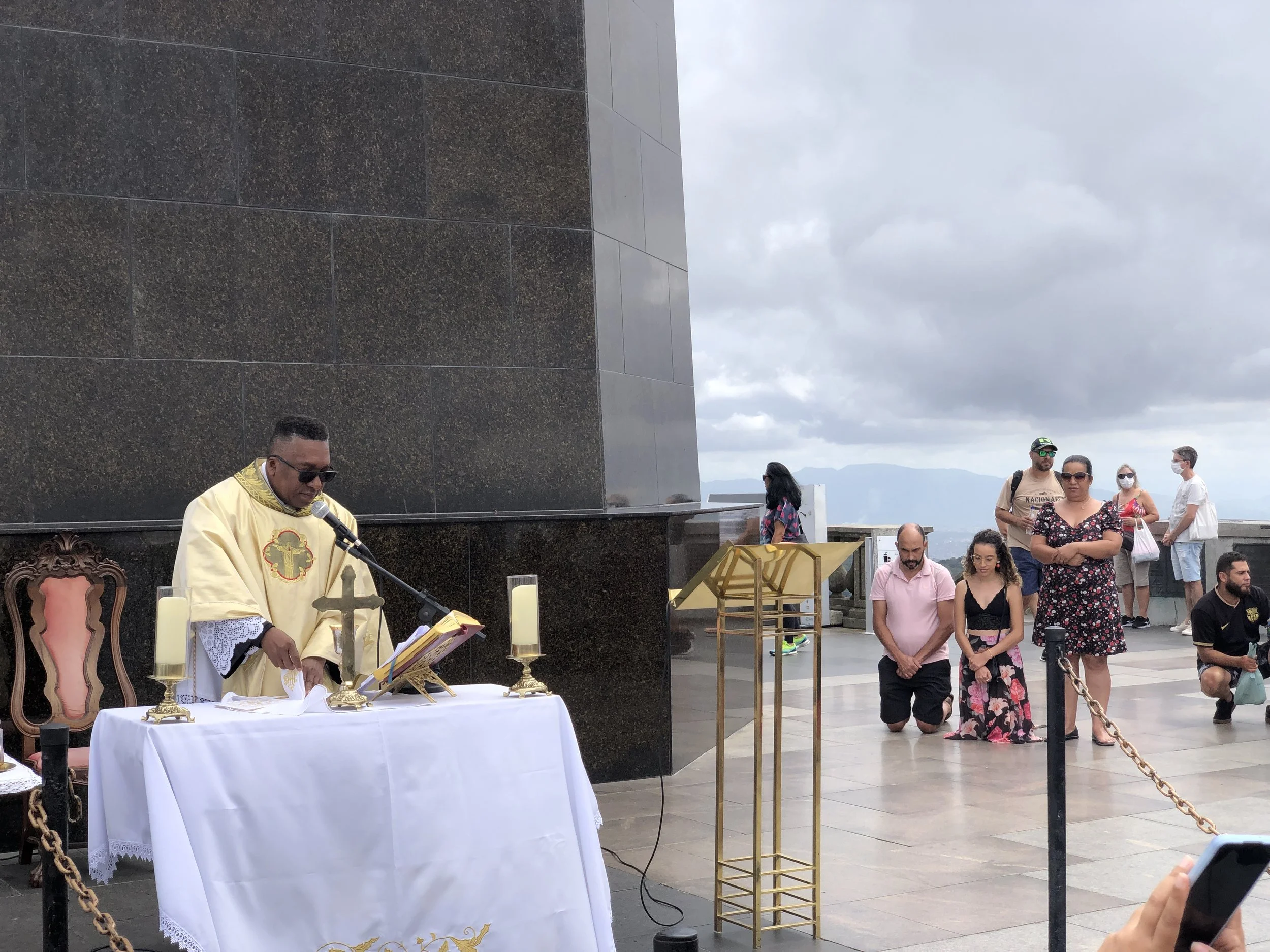 About an hour and fourth five minutes after commencing, with our hands covered in dirt, we reached Jesus. Most people had taken the funicular to the top and were dressed in Sunday best--nice dresses and colorful Brazilian pant suits. A priest was conducting an Easter service at the foot of The Redeemer while tourists stood and knelt in a circle listening to the prayers.