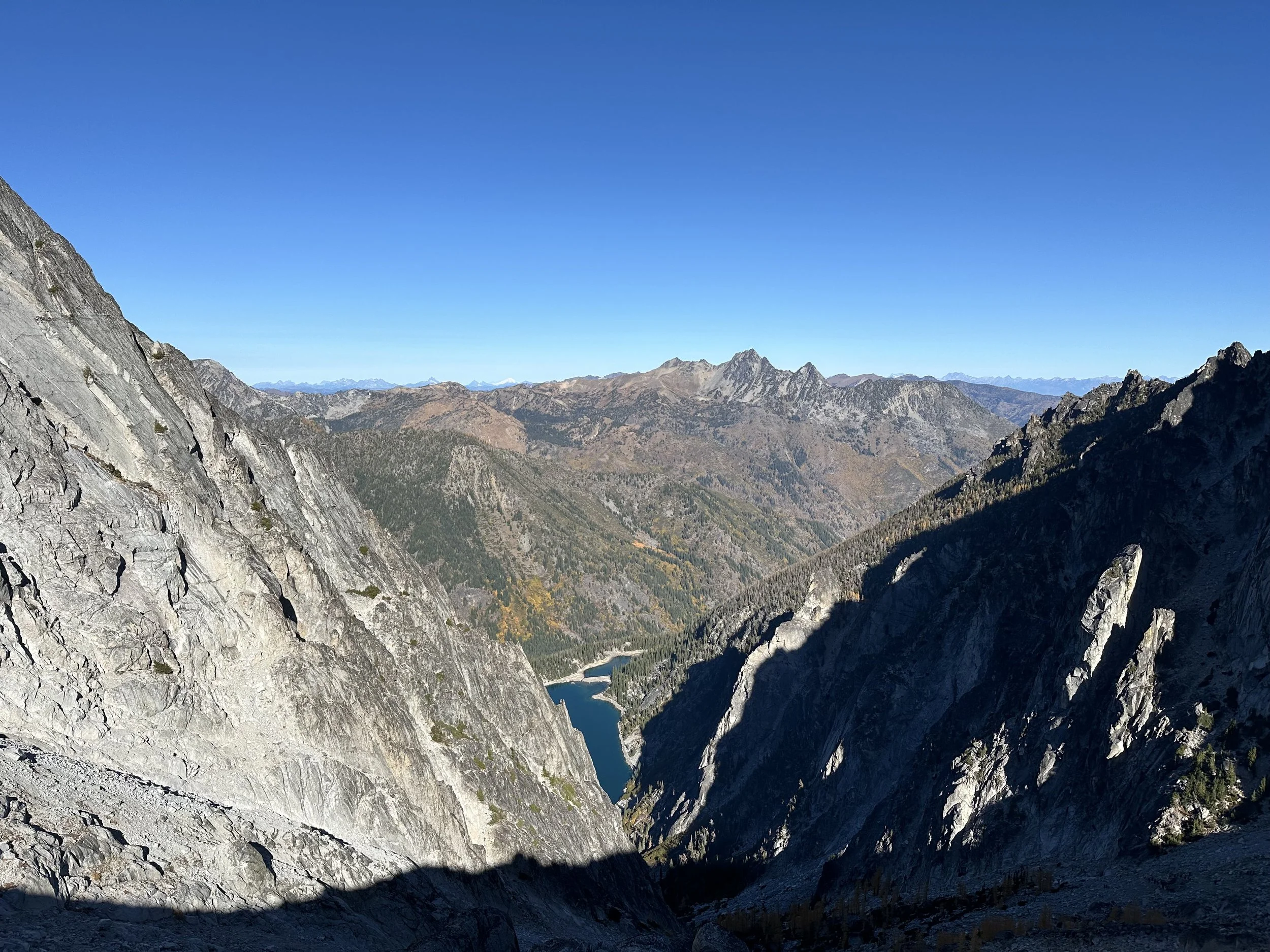 However, as the sun began to shed first light, and my body threw off the veil of sleep, I saw my first glimpse of the peaks surrounding Colchuck Lake. The rising sun painted the mountainside red. I began to get excited. A little while later, we arrived at the lake, and I started laughing out loud. It was so stunning it shocked me. It was so gorgeous it made up for the morning’s torture. We ate some breakfast and continued to hike around the lake. The beauty bolstered me for the next challenge: Aasgard Pass.