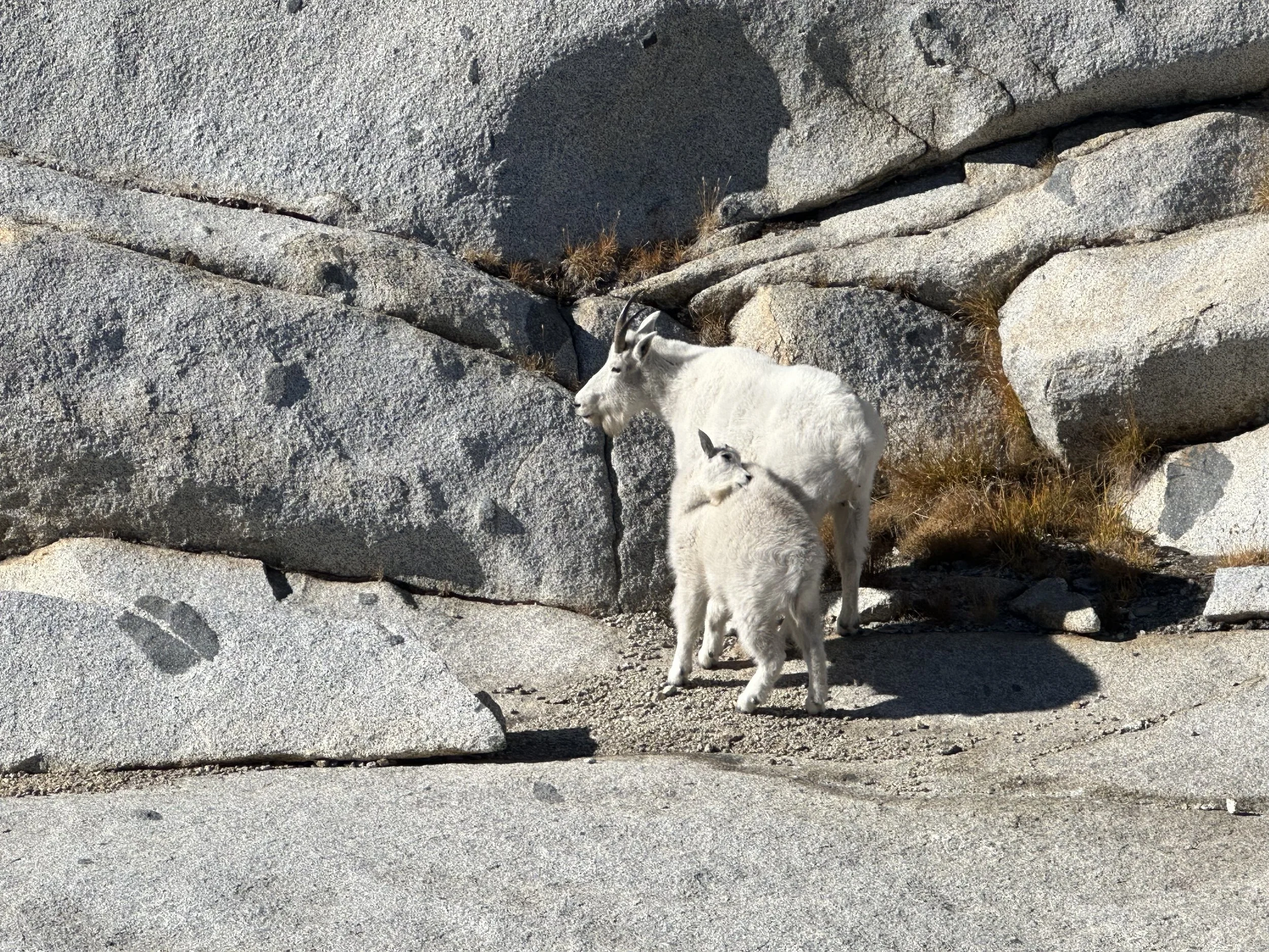 The next six or so miles of the hike were as beautiful as everyone had promised. This terrain wasn’t especially steep, and we enjoyed a brief respite from the slog as we admired the scenery. The sun was out on a perfect fall day, and all the larches had turned golden yellow, making the whole landscape glow. There were several lakes, but each one was special, and we exclaimed at the beauty of each one, like receiving one heartfelt gift after another on Christmas morning. The most precious gift of all was seeing a mother and baby goat wandering around the lake.