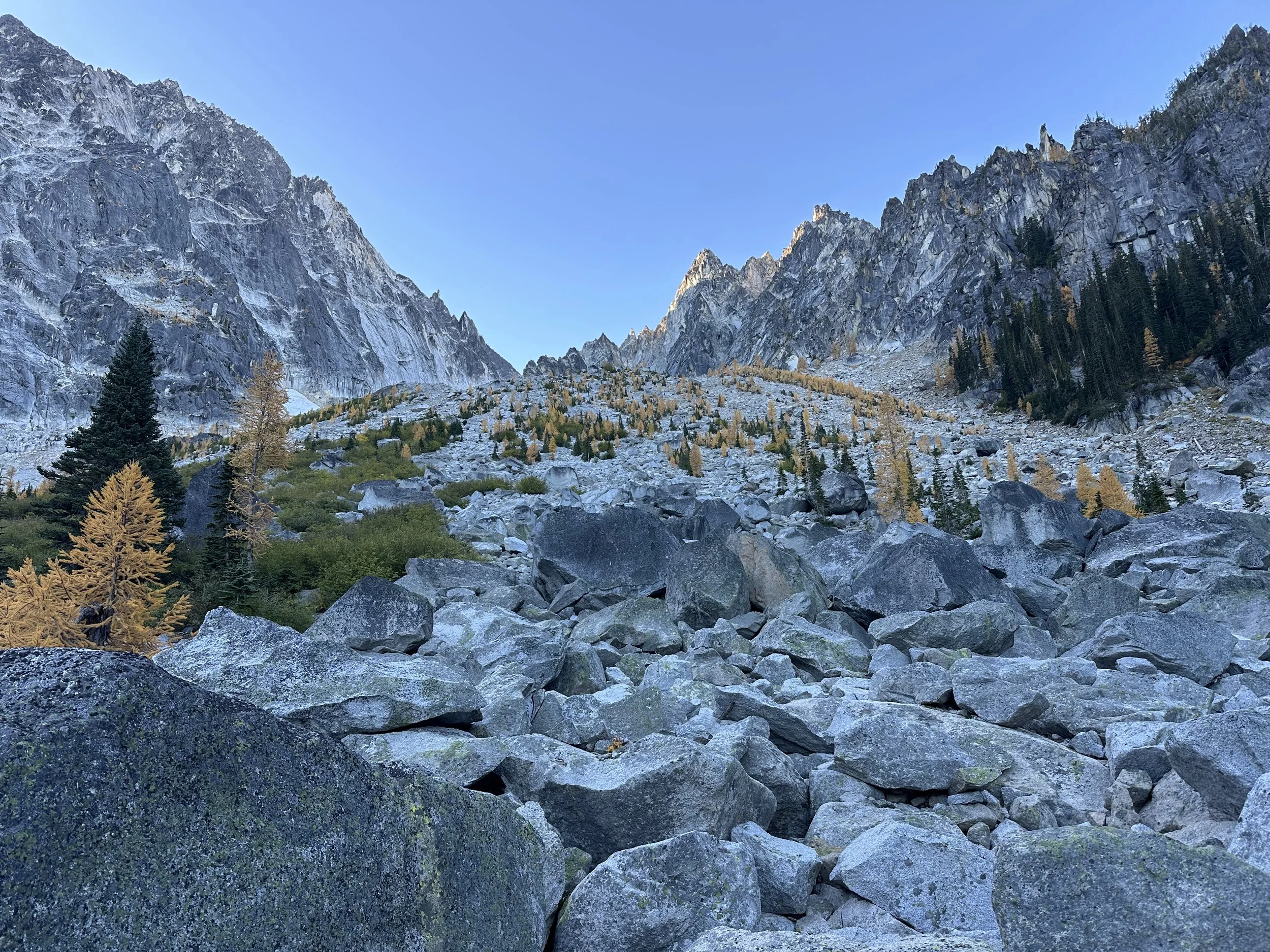 Instead of taking two cars to drop at each point, we boarded a packed van at 5:00 AM to shuttle us from Snow Lakes Trailhead (where we would end) to Stuart & Colchuck Lake Trailhead. There were at least eight vans and dozens of cars at the trailhead. During the hellish, 20-minute ride, jostled by turbulence worse than a crash landing, I realized I was surrounded by lunatics eager to hike 14 hours before dawn—and I was one of them. Just as I wouldn’t consider myself “outdoorsy”, I also wouldn’t consider myself a “morning person”. Unfortunately, those identities seem correlated, judging by the crowd of hikers bursting with excitement at the trailhead. Operating on four hours of sleep, I donned my headlamp and took my place in the caravan of people trudging up to Colchuck lake.
