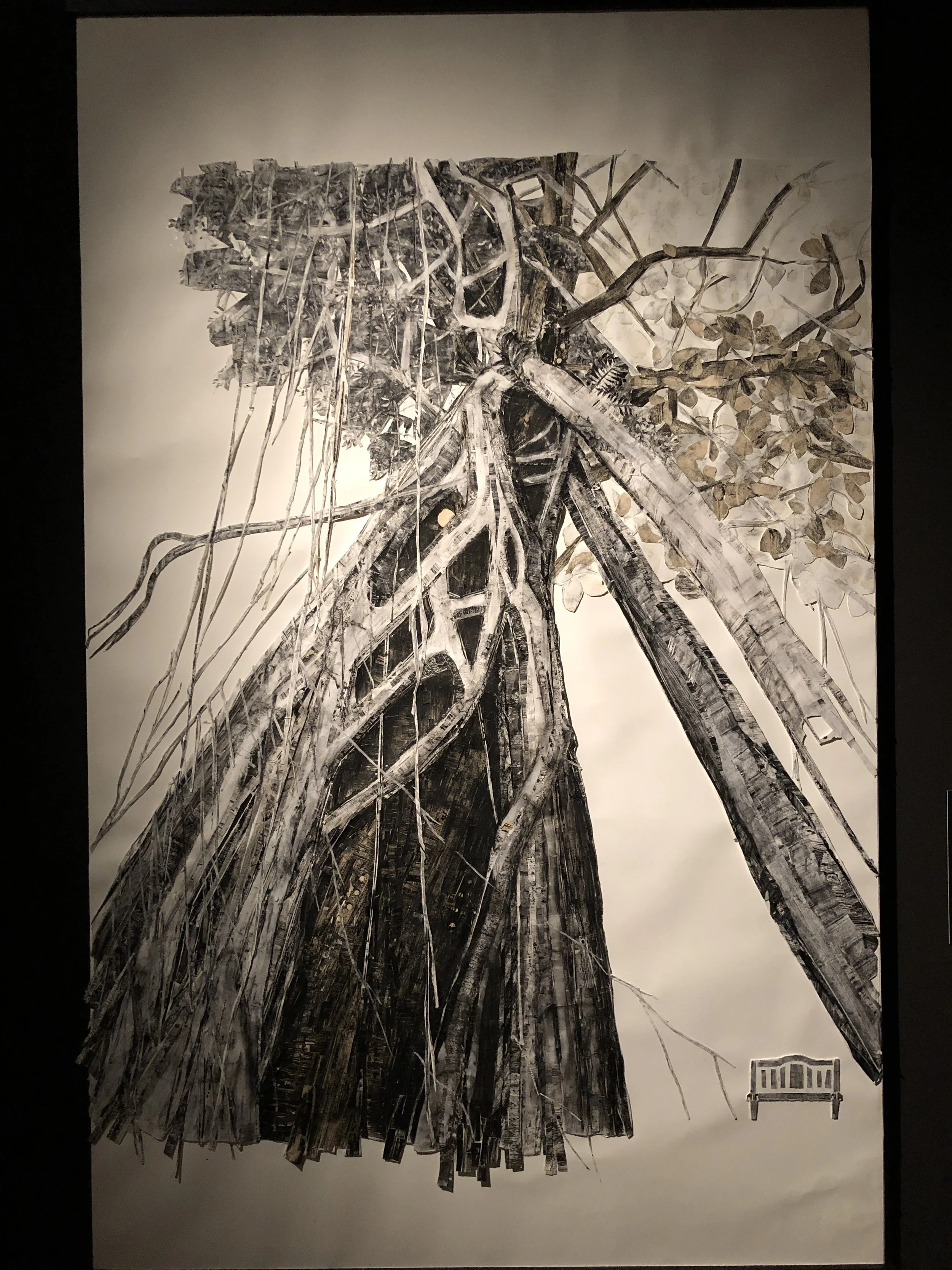 This work belongs to a "ten year material-led process of research into stories of wood in Southeast Asia." The description explained that "instead of searching for 'the spirit in the wood'...the collages are made of small variegated fragments of prints of the objects, pasted laboriously together again." The works themselves were each meant to elicit different feelings and stories, but the overarching theme of "wood cuttings" were representative of regional deforestation. On another floor, each room was dedicated to a different artist who had received top accolades in the Taipei Art Awards 2018 competition. As such, each room felt very different as it took on the message and content of the individual artist.
